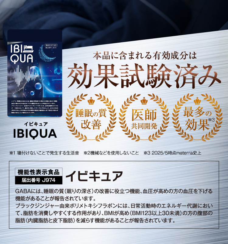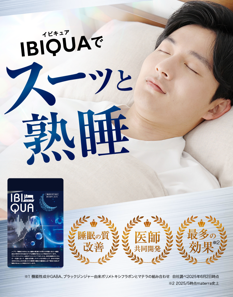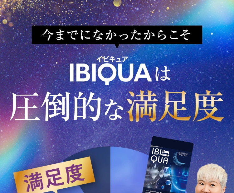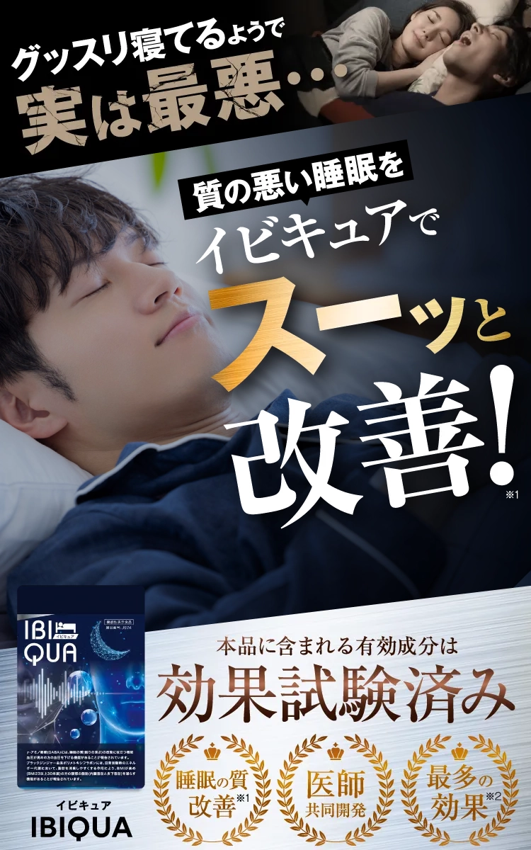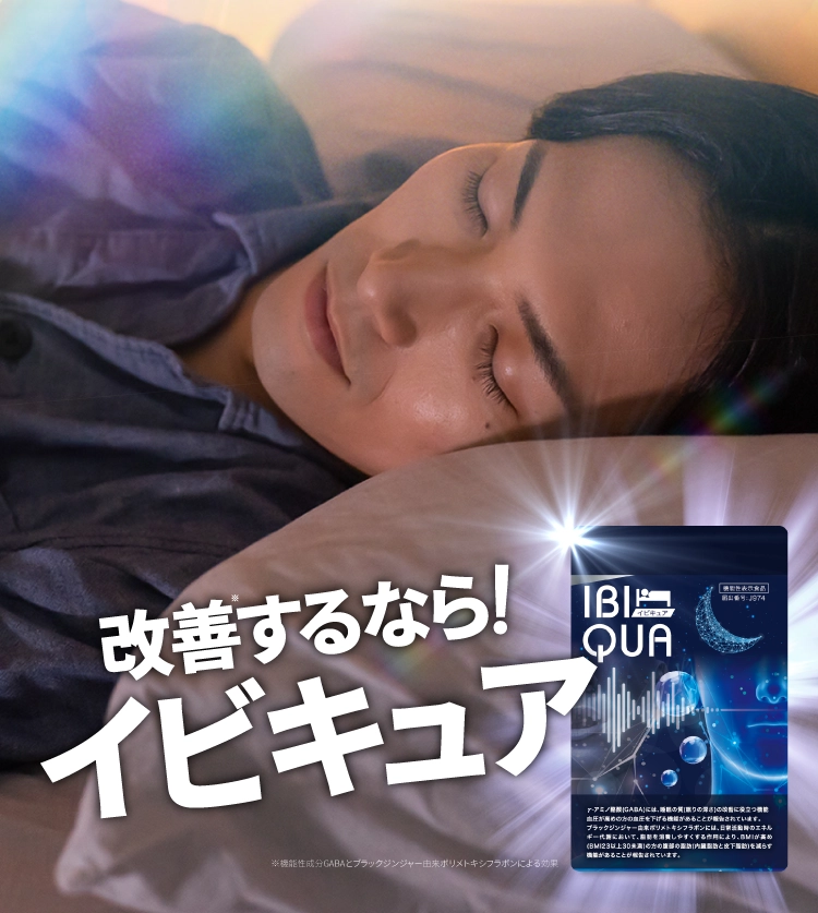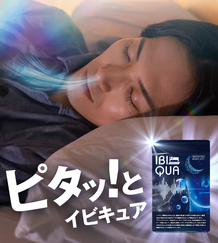 『IBIQUA(イビキュア)』 は、忙しい現代人のために開発された、睡眠の質を向上させるサプリメントです。寝息や睡眠不足に悩む方々に最適なこのサプリメントは、科学的根拠に基づいたGABAやブラックジンジャーなど、科学的に裏付けられた成分を厳選した日本初処方になります。毎日の生活で感じる疲れやストレスを軽減し、リラックスした状態での深い眠りをサポートします。