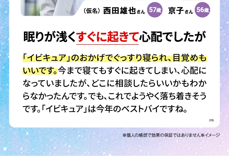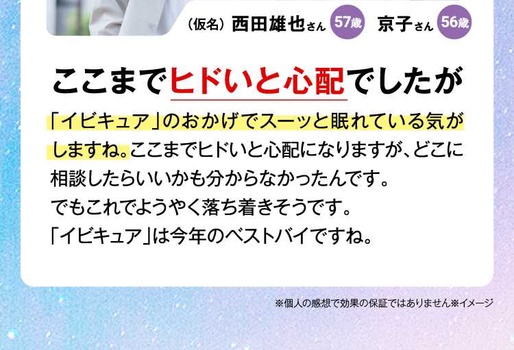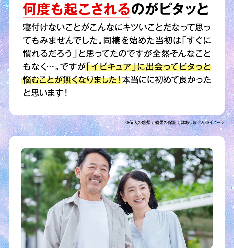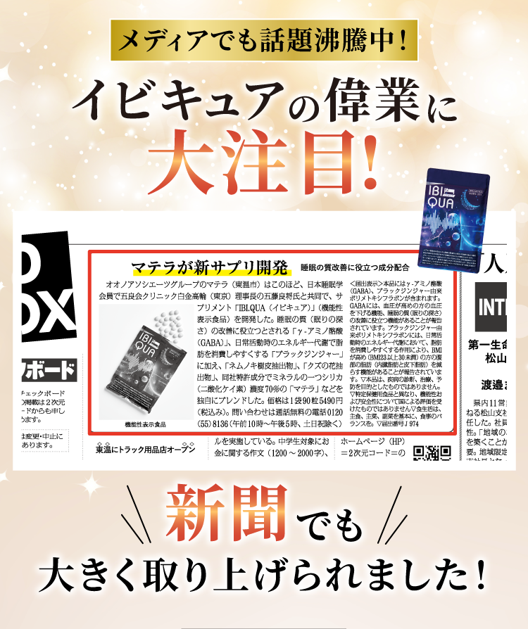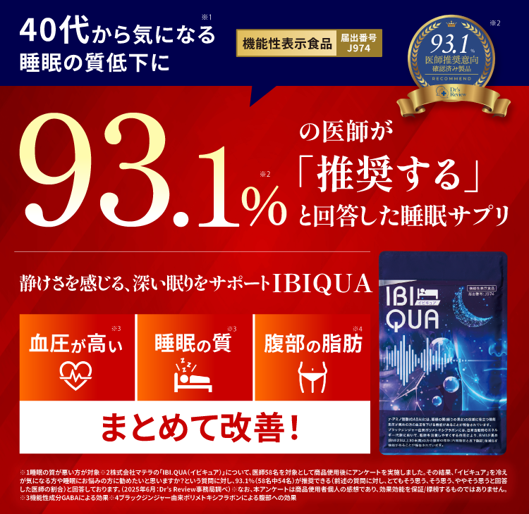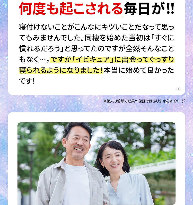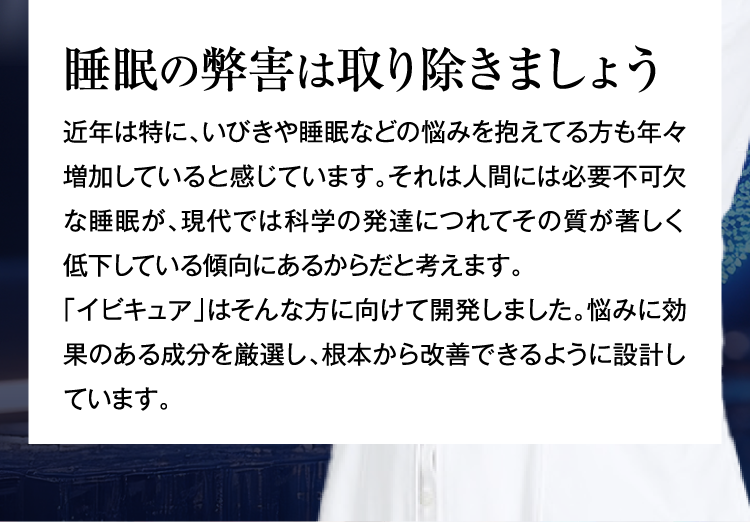 『IBIQUA(イビキュア)』 は、忙しい現代人のために開発された、睡眠の質を向上させるサプリメントです。寝息や睡眠不足に悩む方々に最適なこのサプリメントは、科学的根拠に基づいたGABAやブラックジンジャーなど、科学的に裏付けられた成分を厳選した日本初処方になります。毎日の生活で感じる疲れやストレスを軽減し、リラックスした状態での深い眠りをサポートします。