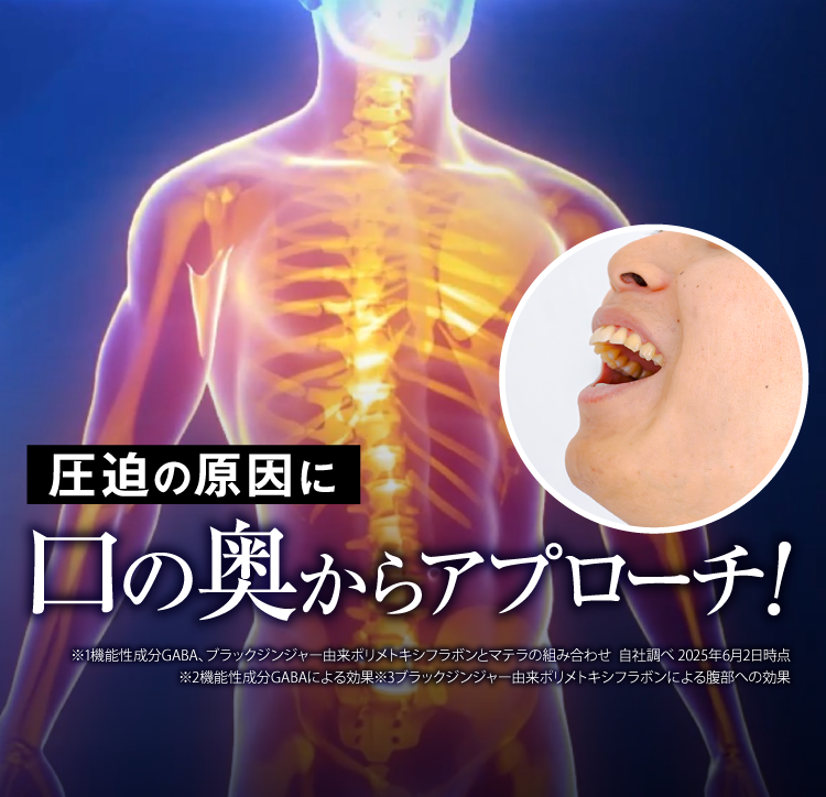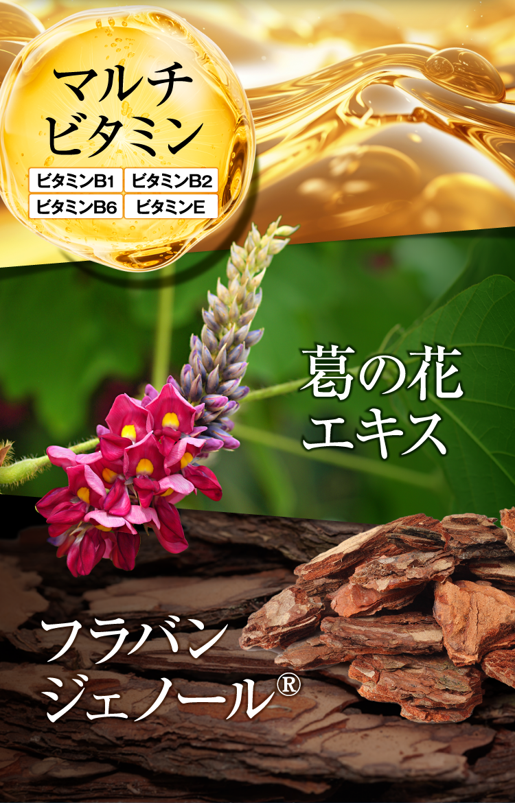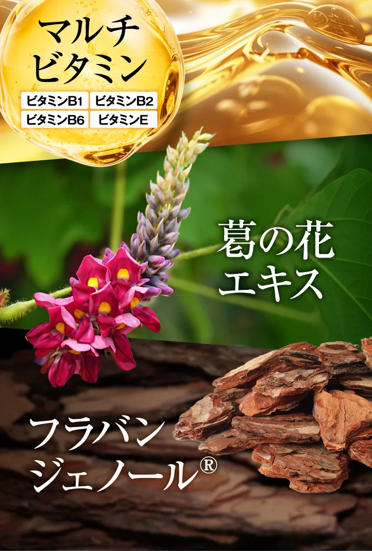 還元麦芽糖水飴(国内製造)、γ-アミノ酪酸、ブラックジンジャー抽出物(ブラックジンジャー抽出物、デキストリン)、ビタミンE含有植物油、オルニチン、ネムノキ樹皮抽出物、葛の花抽出物、松樹皮抽出物、流紋岩末/セルロース、シクロデキストリン、ビタミンB1、ステアリン酸カルシウム、二酸化ケイ素、加工デンプン、ビタミンB2、ビタミンB6、トリプトファン、ロイシン、クエン酸、クエン酸カルシウム、香辛料抽出物