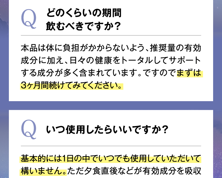 1日3粒を目安に水またはぬるま湯でお召し上がりください。